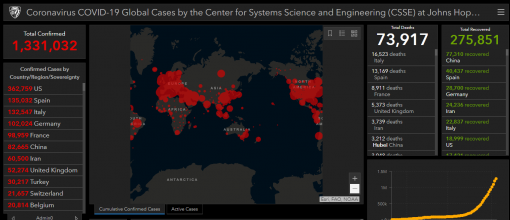 No total, o novo coronavírus já atingiu 1.331.032 pessoas pelo mundo, incluindo mais de 981 mil casos ativos, 275.851 casos de pessoas recuperadas e mais de 73.917 mil óbitos. Nas plataformas, ao lado do mapa, há também uma tabela com informações gerais de todo o globo, incluindo os países mais infectados, além de reportagens que trazem mais detalhes sobre os casos.